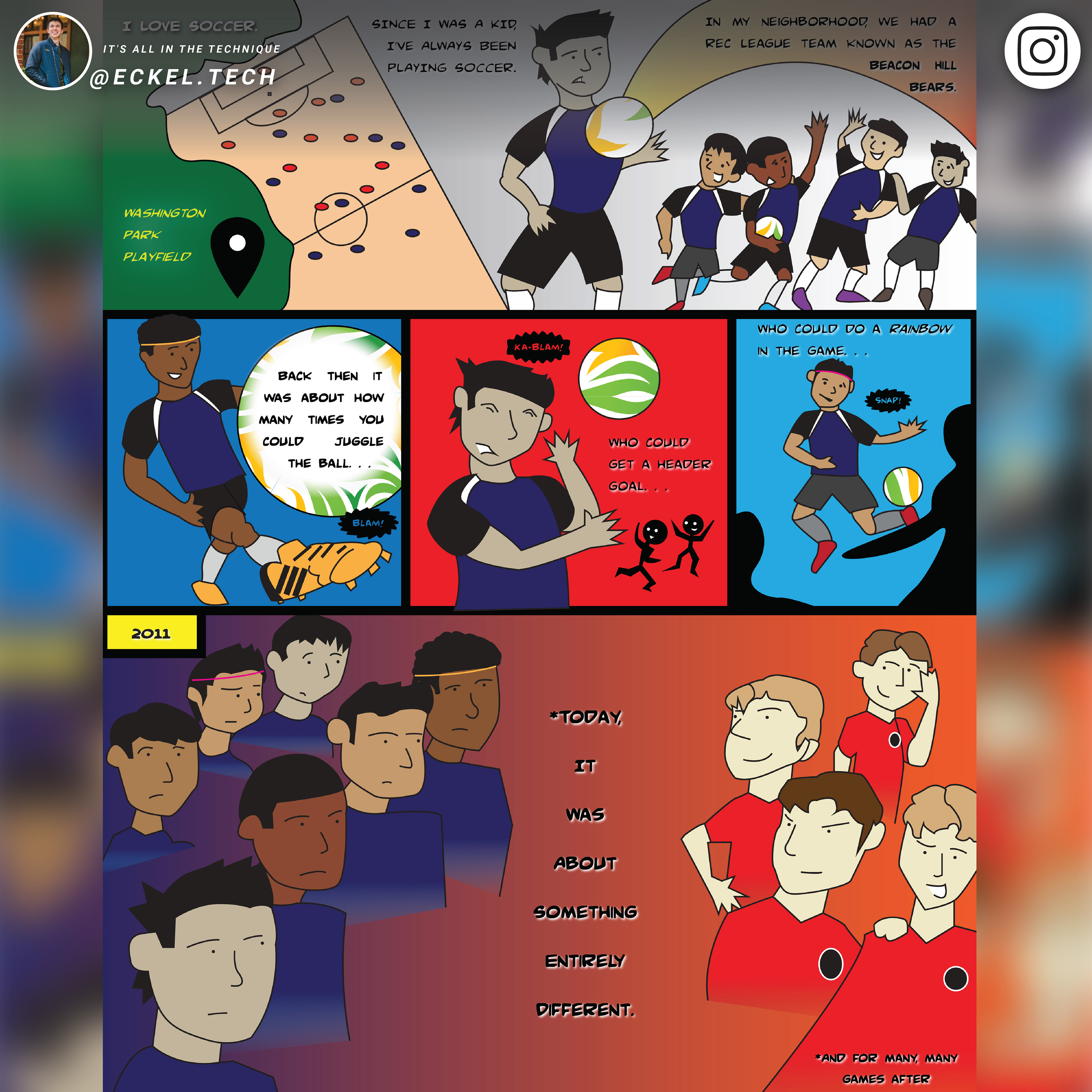 A Rec League Memory is a story about a small triumphant victory against on field adversity. All the details and depictions are very intentional throughout the comic. The referee does not have any eyes. Instead of officiating equally and fairly, the referee already sees what they want to believe, bringing in a bias and a “self-fulfilling prophecy” that only the Beacon Hill Bears (the South End team) can cause trouble. The variations in skin tone, equipment, as well as the background colors are all to drive home the point of how differences are important and beautiful, no Colorblindness here. I wanted to treat the circular badge adorned by the “NORTH END” team as a symbol of aligning with white supremacy; the opposing teams’ parents have passed on their beliefs and power onto their kids, and the badge is a signifier of their privilege. Most importantly, I wanted to show a small glimpse of what happens when the intense game is done. Did we, the Beacon Hill Bears, really win? We walk away remembering their words and actions towards us. And they walk into the next moment, unphased.